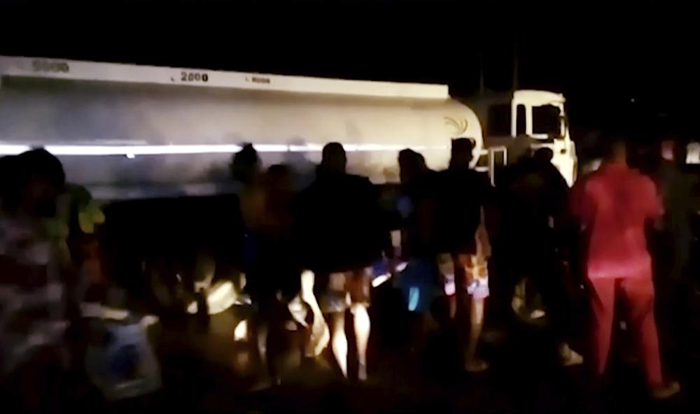 People gather around an oil tanker to collect leaking fuel before it exploded near Sierra Leone's capital, killing at least 92 people and severely injuring dozens of others, officials and witnesses said Saturday, Nov. 6, 2021. The explosion took place late Friday after a bus struck the tanker in Wellington, a suburb just to the east of Freetown. (AP Photo)
