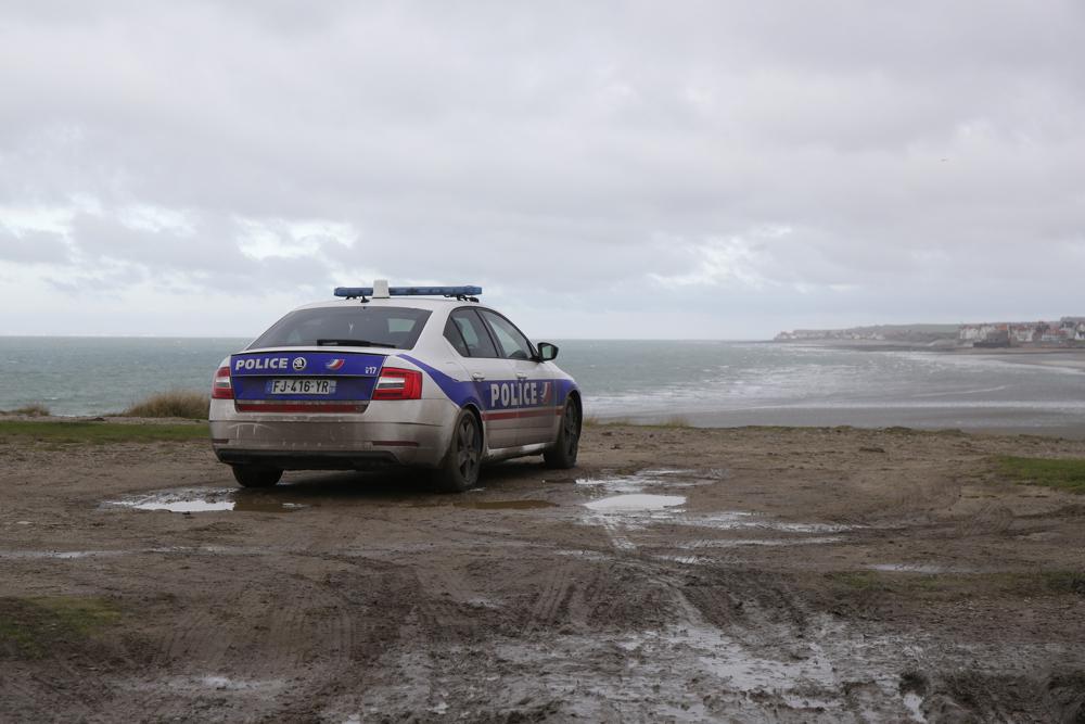 A police car parks over the shore in Wimereux, northern France, Thursday, Nov. 25, 2021 in Calais, northern France. Children and pregnant women were among at least 27 migrants who died when their small boat sank in an attempted crossing of the English Channel, a French government official said Thursday. French Interior Minister Gerald Darmanin also announced the arrest of a fifth suspected smuggler thought to have been involved in what was the deadliest migration tragedy to date on the dangerous sea lane.(AP Photo/Michel Spingler)