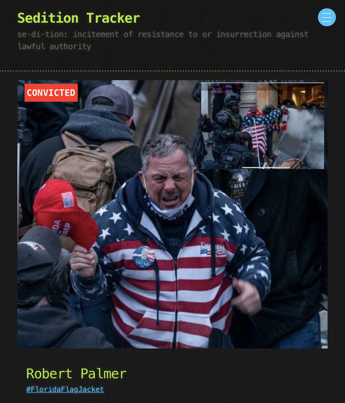 "Robert S. Palmer, 54, of Largo, Fla., pleaded guilty in October to assaulting law enforcement officers with a dangerous weapon, and his original plea agreement called for a sentencing range of 46 to 57 months. But after his plea, and his entry into the D.C. jail, Palmer arranged to make an online fundraising plea in which he said he did go on the defense and throw a fire extinguisher at the police after being shot with rubber bullets and tear gas.