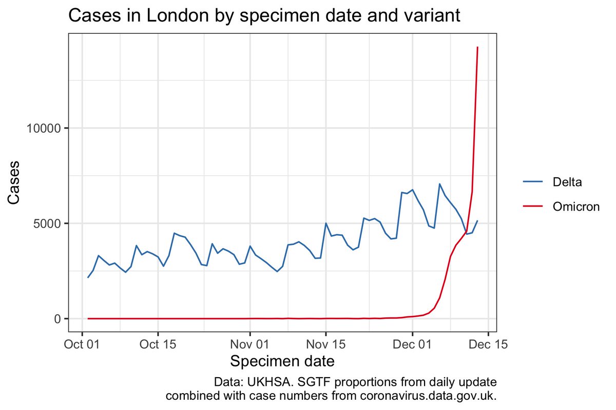Looks like Omicron became dominant in England on Tuesday (54.2% on 14th December specimens). And it's extremely striking how England growth (red) is at exactly the same speed as London (blue). Two regression lines are basically parallel, just England is ~4 days behind.
