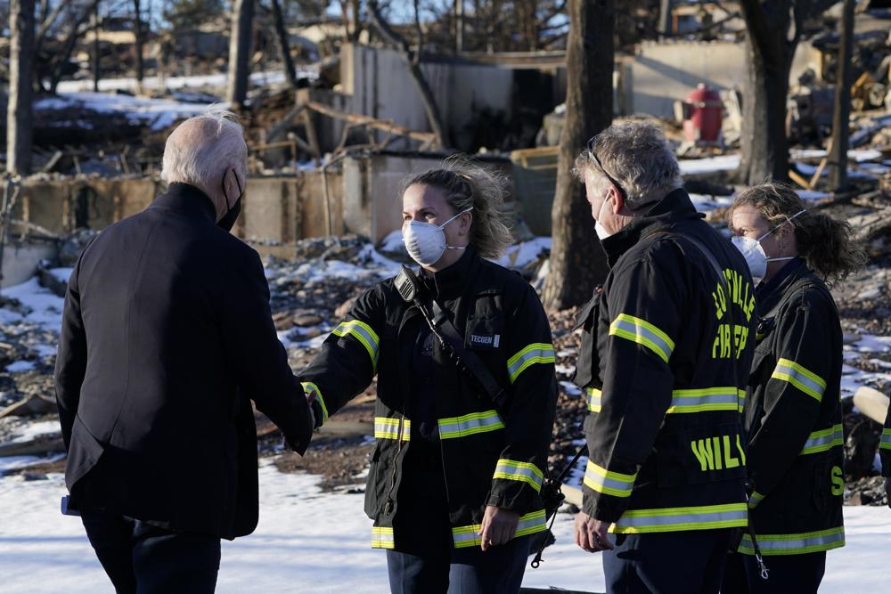 President Joe Biden greets first responders as he tours a neighborhood in Louisville, Colo., Friday, Jan. 7, 2022, that was impacted by the recent wildfire. (AP Photo/Susan Walsh)