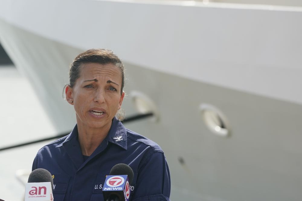 U.S. Coast Guard Captain Jo-Ann Burdian speaks during a news conference, Thursday, Jan. 27, 2022, at Coast Guard Sector Miami in Miami Beach, Fla. The Coast Guard says it has found four more bodies in its search for dozens of migrants lost at sea off Florida, for a total of five bodies. The maritime security agency said Thursday that it also plans to call off its active search for survivors at sunset if it doesn't receive any new information. (AP Photo/Wilfredo Lee)