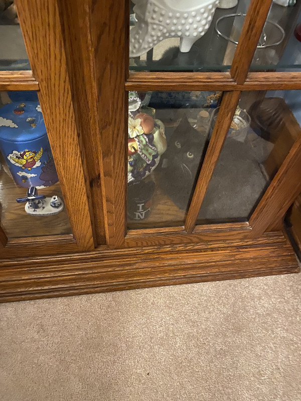 Here she is, pretending to be a piece of bric-a-brac in my curio cabinet. Dont worry, she can get out on the side, which is open, whenever she wants. Shes a Manx, stumpy, about six months old. Her sister, who I also adopted and named Buffy, is also a black Manx, rumpy. Shes not as brave as her sister, so I dont see as much of her yet.