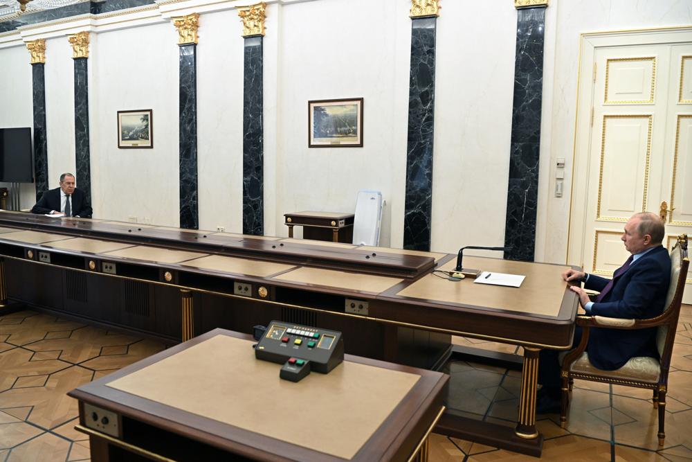 Russian President Vladimir Putin, right, meets with Russian Foreign Minister Sergey Lavrov, left, in Moscow, Russia, Monday, Feb. 14, 2022. Russia's top diplomat has advised President Vladimir Putin to continue talks with the West on Russian security demands amid tensions over Ukraine. Speaking at the start of a meeting with Putin, Foreign Minister Sergey Lavrov suggested Russia should continue a dialogue with the U.S. and its allies even though they have rejected Moscow's main security demands. (Alexei Nikolsky, Sputnik, Kremlin Pool Photo via AP)
