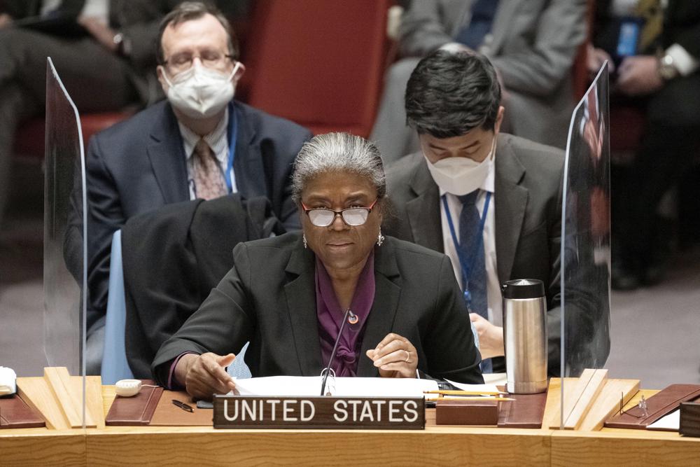 In this image provided by the United Nations, U.S. Ambassador to the United Nations Linda Thomas-Greenfield speaks during an emergency U.N. Security Council meeting on Ukraine, at the U.N. headquarters, Monday, Feb. 21, 2022. (Evan Schneider/United Nations via AP)