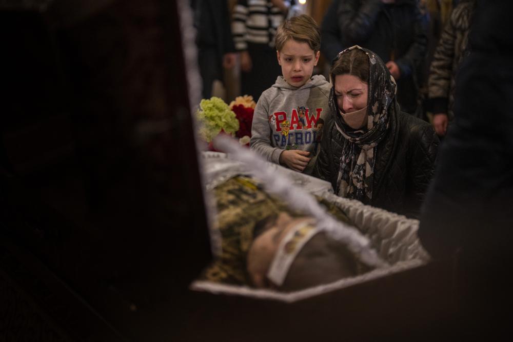 A woman and a boy react next to the body of Ukrainian Army captain Anton Sydorov, 35, killed in eastern Ukraine, during his funeral, in Kyiv, Ukraine, Tuesday, Feb. 22, 2022. Western leaders said Tuesday that Russian troops have moved into rebel-held areas in eastern Ukraine after President Vladimir Putin's recognized their independence but some indicated it was not yet the long-feared full-fledged invasion as confusion reigned in the region. (AP Photo/Emilio Morenatti)