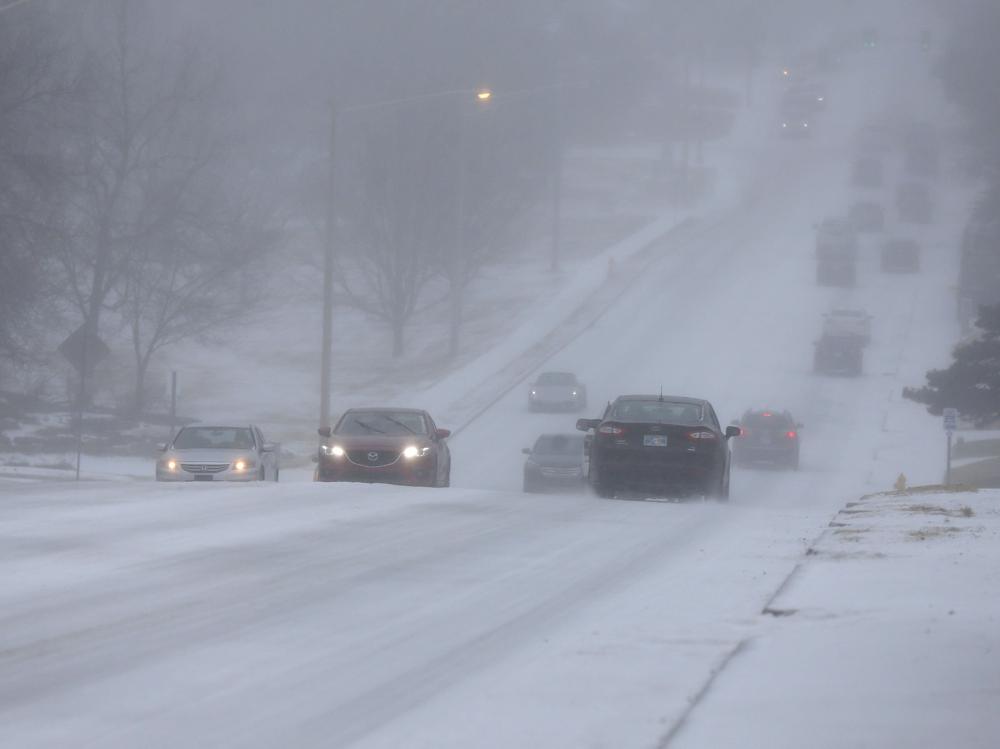 Motorists drive during a sleet storm in Tulsa, Okla,, Wednesday, Feb. 23, 2022. (Stephen Pingry/Tulsa World via AP)