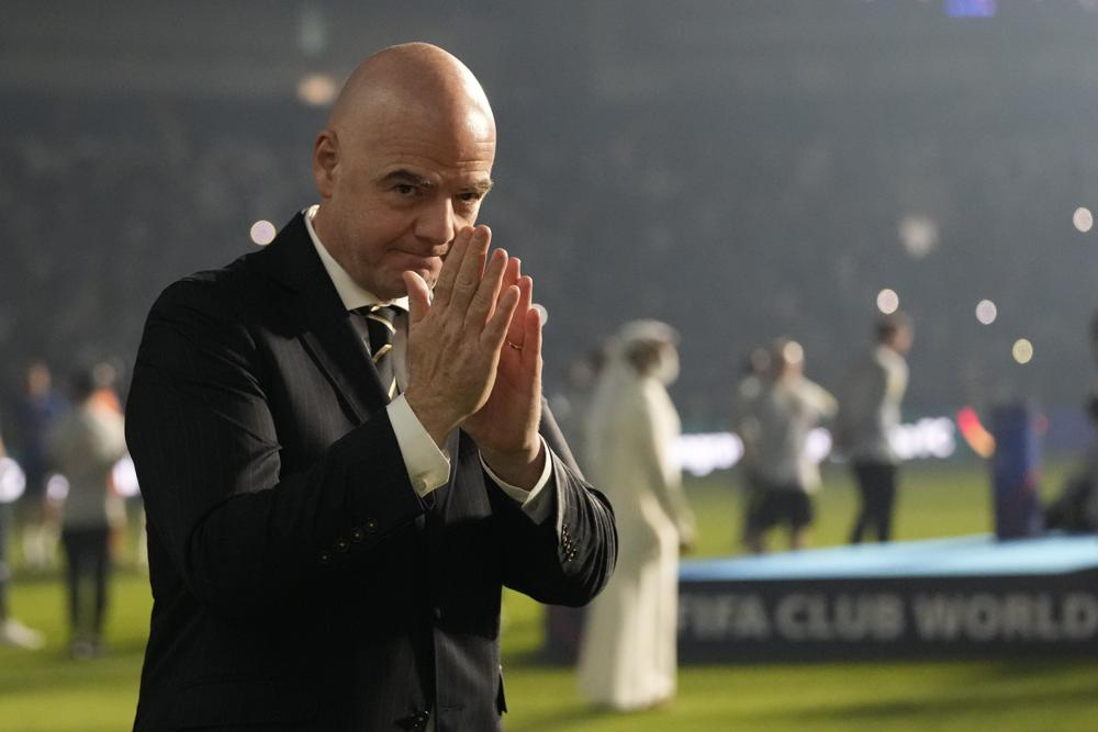 FIFA President Gianni Infantino gestures to media end of the Club World Cup final soccer match between Palmeiras and Chelsea at Mohammed Bin Zayed Stadium in Abu Dhabi, United Arab Emirates, Saturday, Feb. 12, 2022. (AP Photo/Hassan Ammar)