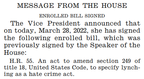Read more: https://thehill.com/homenews/administration/600244-biden-signs-bill-making-lynching-a-federal-hate-crime