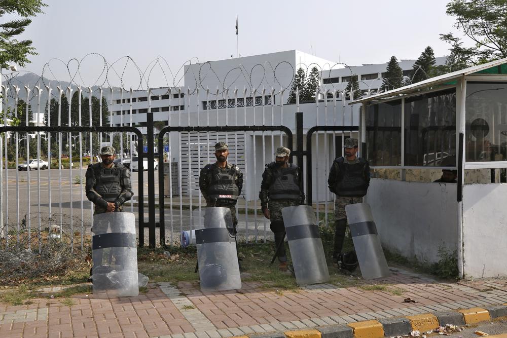 Pakistani paramilitary troops stand guard with riot gears outside the National Assembly, in Islamabad, Pakistan, Sunday, April 3, 2022. Pakistan's embattled prime minister faces a no-confidence vote in Parliament on Sunday and the opposition said it has the numbers to win after Imran Khan's allies and partners in a fragile coalition abandoned him. (AP Photo/Anjum Naveed)