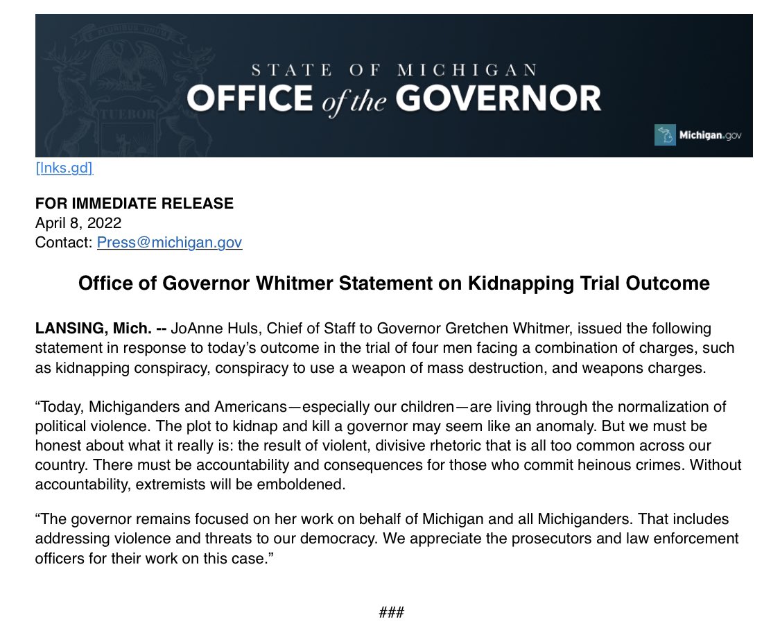 Read more: https://www.detroitnews.com/story/news/local/michigan/2022/04/08/michigan-governor-whitmer-federal-kidnap-conspiracy-trial-verdict/9487618002/