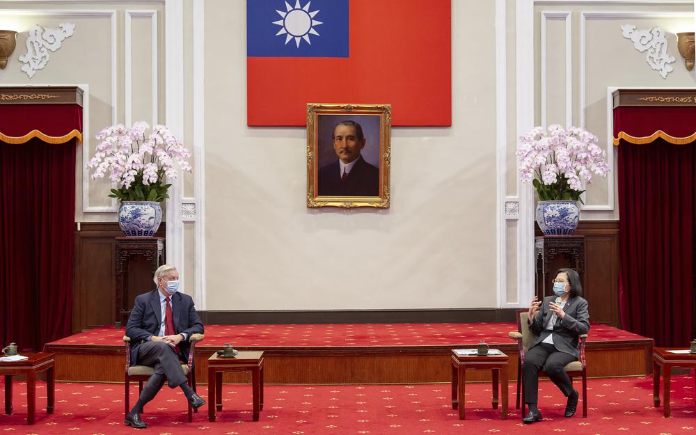 In this photo released by the Taiwan Presidential Office, Sen. Lindsey Graham, R-S.C., left, listens as Taiwan's President Tsai Ing-wen, right, speaks during a meeting at the Presidential Office in Taipei, Taiwan, Friday, April 15, 2022. U.S. lawmakers visiting Taiwan have made a pointed and public declaration of their support for the self-governing island democracy while also issuing a warning to China. (Taiwan Presidential Office via AP)