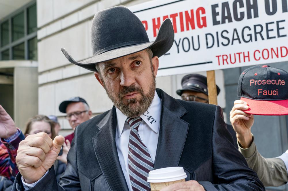 FILE - Otero County, N.M., Commissioner Couy Griffin stands outside the federal court after receiving a verdict in his trial on March 22, 2022 in Washington. New Mexicos secretary of state asked the state's Supreme Court on Tuesday, June 14, 2022, to order the Republican-led commission of rural Otero County to certify primary election results after it refused to do so over distrust of Dominion vote-tallying machines. (AP Photo/Gemunu Amarasinghe, File)
