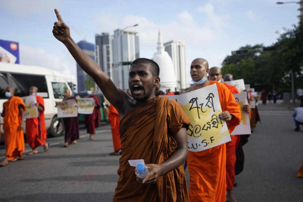 Sri Lankan student Buddhist monks shout slogans as they march demanding President Gotabaya Rajapaksa resign over the economic crisis in Colombo, Sri Lanka, Monday, June 20, 2022. (AP Photo/Eranga Jayawardena)