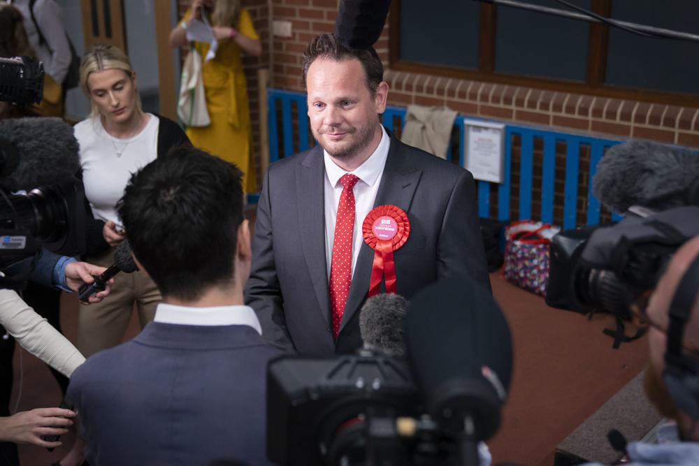 Labour candidate Simon Lightwood speaks to media, after winning the Wakefield by-election, following the by-election count at Thornes Park Stadium in Wakefield, West Yorkshire Friday, June 24, 2022. The by-election was triggered by the resignation of Imran Ahmad Khan following his conviction for sexual assault. (Danny Lawson/PA via AP)
