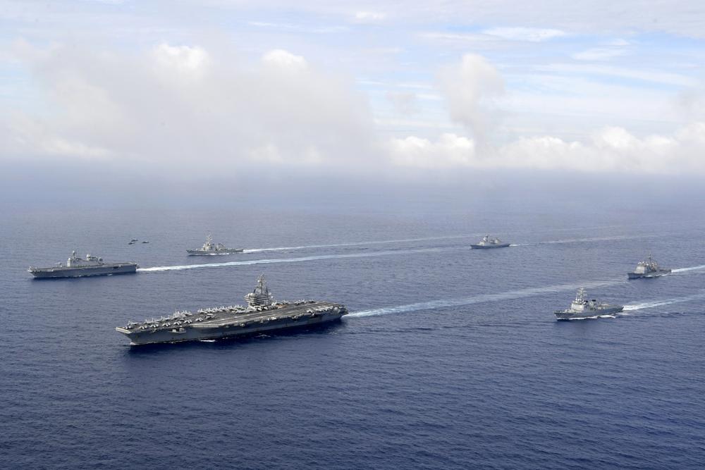 FILE - In this photo provided by South Korea's Defense Ministry, U.S. nuclear-powered aircraft carrier USS Ronald Reagan, second from left, and South Korea's landing platform helicopter (LPH) ship Marado, left, sail during a joint military exercise at an undisclosed location, June 4, 2022. (South Korea Defense Ministry via AP, File)
