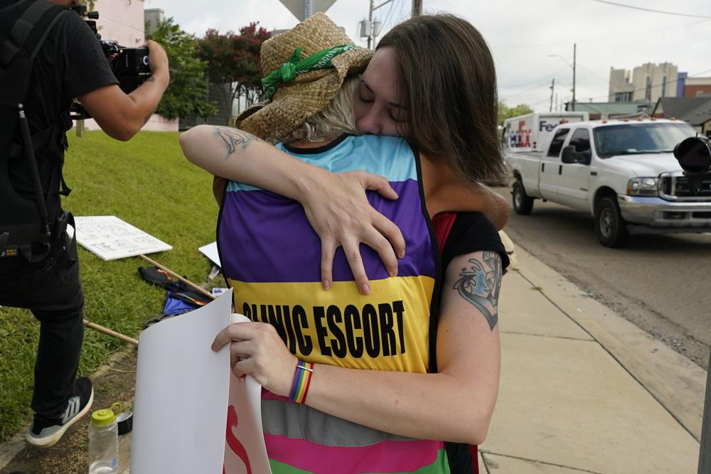 Derenda Hancock, co-director of the Jackson Women's Health Organization clinic patient escorts, better known as the Pink House defenders, left, hugs a tearful abortion rights supporter Sonnie Bane, outside the Jackson Women's Health Organization clinic in Jackson, Miss., Wednesday, July 6, 2022. The clinic is the only facility that performs abortions in the state. However, on Tuesday, a chancery judge rejected a request by the clinic to temporarily block a state law banning most abortions. Without other developments in the Mississippi lawsuit, the clinic will close at the end of business Wednesday and the state law will take effect Thursday. (AP Photo/Rogelio V. Solis)