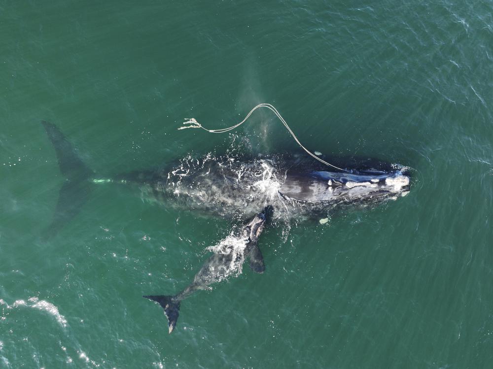 FILE - This Dec. 2, 2021, photo provided by the Georgia Department of Natural Resources shows an endangered North Atlantic right whale entangled in fishing rope being sighted with a newborn calf in waters near Cumberland Island, Ga. The federal government hasn't done enough to protect a rare species of whale from lethal entanglement in lobster fishing gear, and new rules are needed to protect the species from extinction, a judge has ruled, Friday, July 8, 2022. (Georgia Department of Natural Resources/NOAA Permit #20556 via AP)