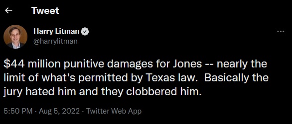 I watched the YouTube video of the Plaintiffs attorney making his closing argument. He said Jones lied like breathing. Hah! And, although he is immune through trial rules, I think, Jones also defamed the father by saying that the father was slow and somewhere on the spectrum. He did this on his show while the bereaved father was testifying in court. So, further defamation during the trial for defamation.