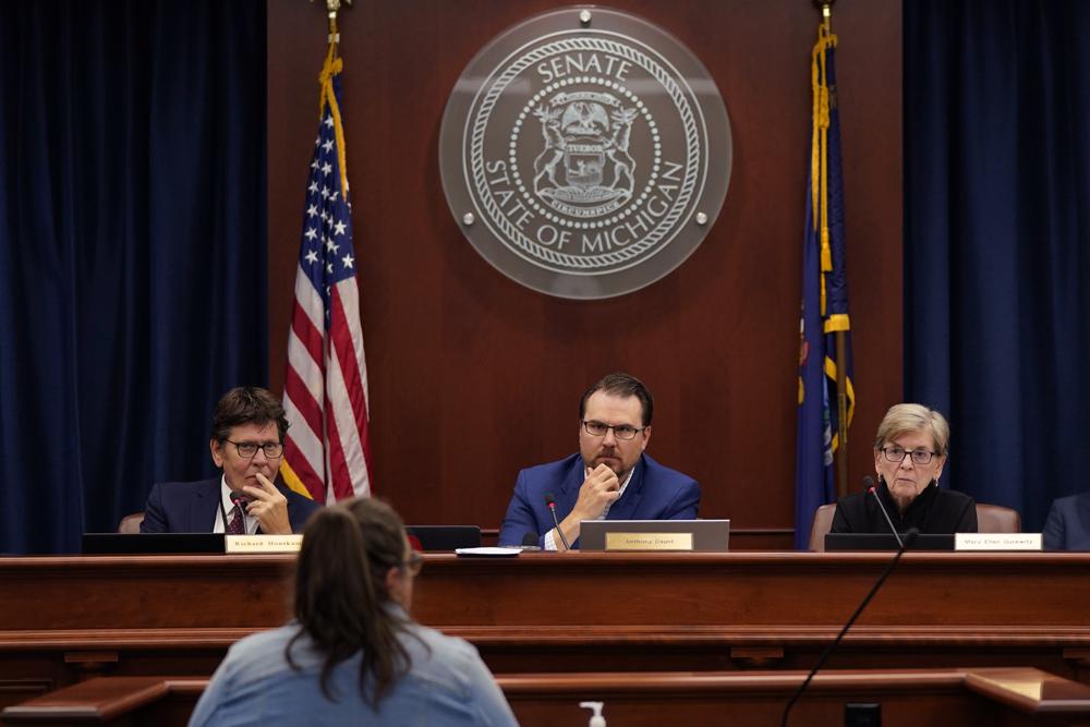 Richard Houskamp, left, Anthony Daunt and Mary Ellen Gurewitz, members of the Michigan state Board of Canvassers listen to a speaker during a hearing, Wednesday, Aug. 31, 2022, in Lansing, Mich. The board is scheduled to decide whether a ballot initiative that seeks to enshrine abortion rights into Michigan's constitution should go to voters in November. (AP Photo/Carlos Osorio)