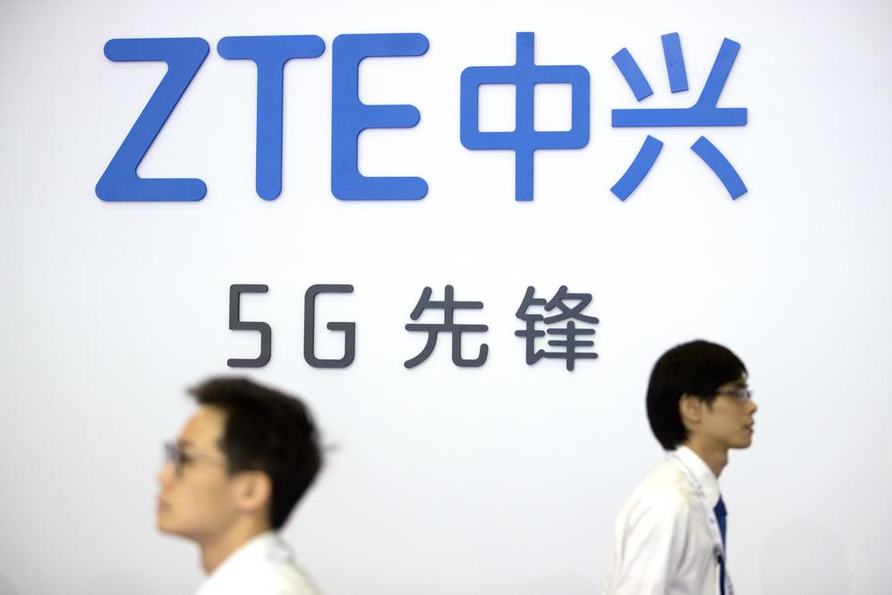 FILE - In this Sept. 26, 2018 file photo, visitors walk past a display from Chinese technology firm ZTE at the PT Expo in Beijing. The U.S. is banning the sale of communications equipment made by Chinese companies Huawei and ZTE and restricting the use of some China-made video surveillance systems, citing an unacceptable risk to national security. The 5-member Federal Communications Commission said Friday, Nov. 25, 2022 it has voted unanimously to adopt new rules that will block the importation or sale of certain technology products that pose security risks. (AP Photo/Mark Schiefelbein, file)