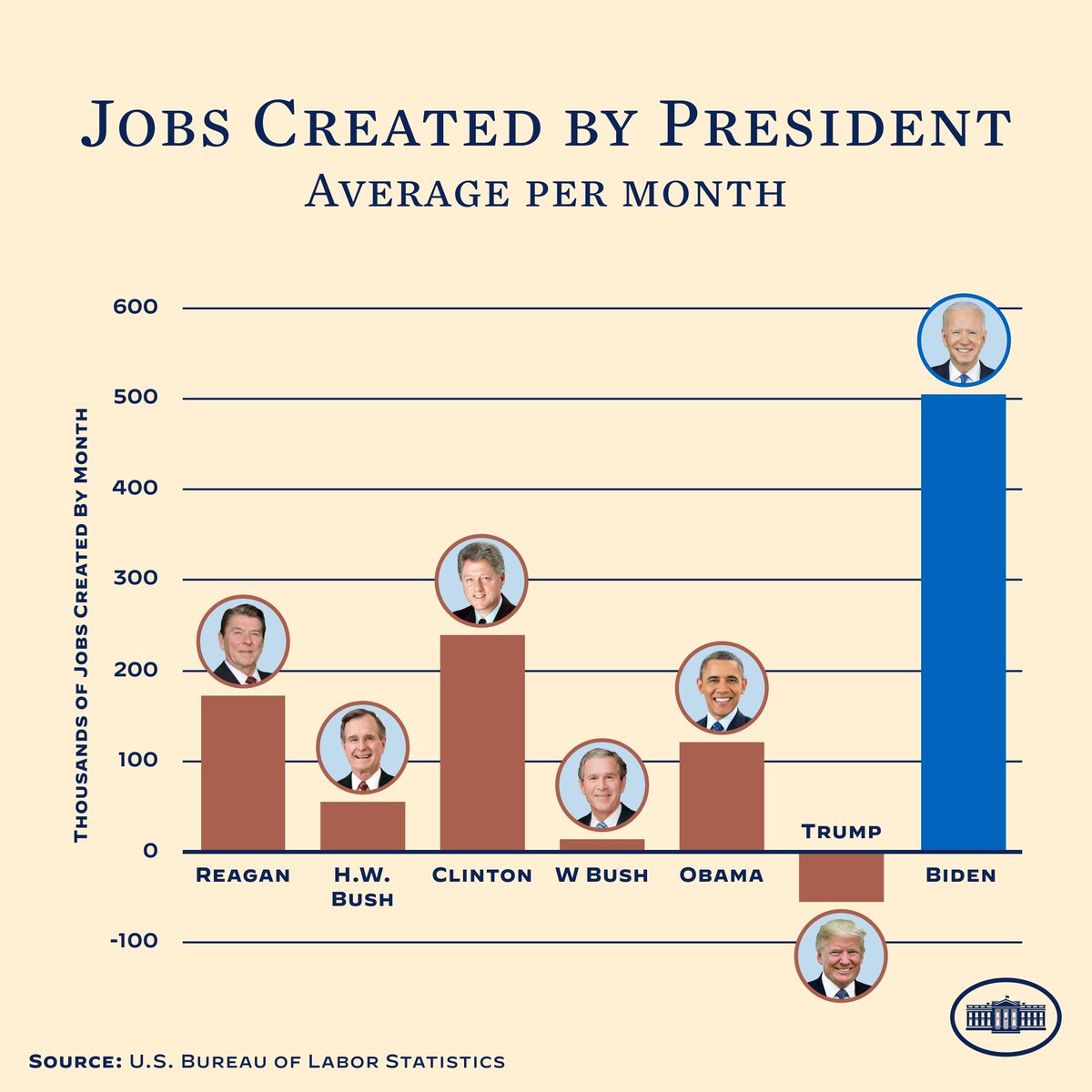 Chart depicting jobs created by president on average per month. President Biden's average per month is 504,300 jobs.