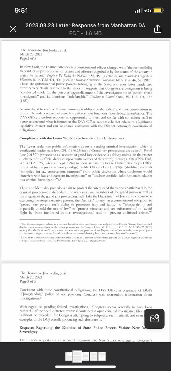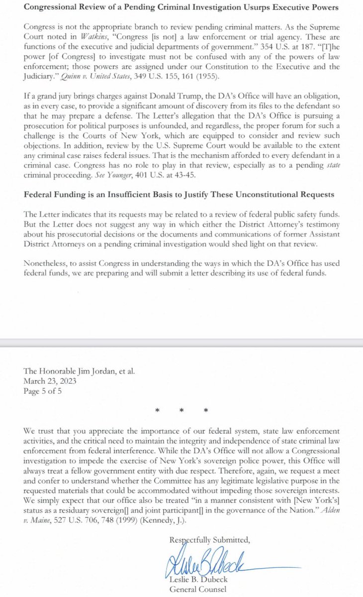 Dubeck's five-page response to the Republicans' demands - which included testimony from Bragg as well as documents and communications related to the investigation - cited case law and legal arguments for why the GOP requests amounted to an "unlawful incursion into New York's sovereignty." She said that the Constitution's 10th Amendment limited the federal government's authority over local law enforcement and argued that Congress specially is not an executive branch entity with law enforcement powers.