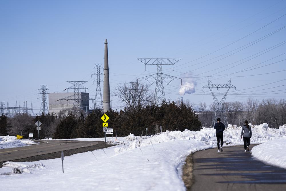People walk on a trail at the Montissippi County Park near the Xcel Energy Monticello Generating Plant, a nuclear power plant, in Monticello, Minn., on Friday, March 24, 2023. (Renee Jones Schneider/Star Tribune via AP)