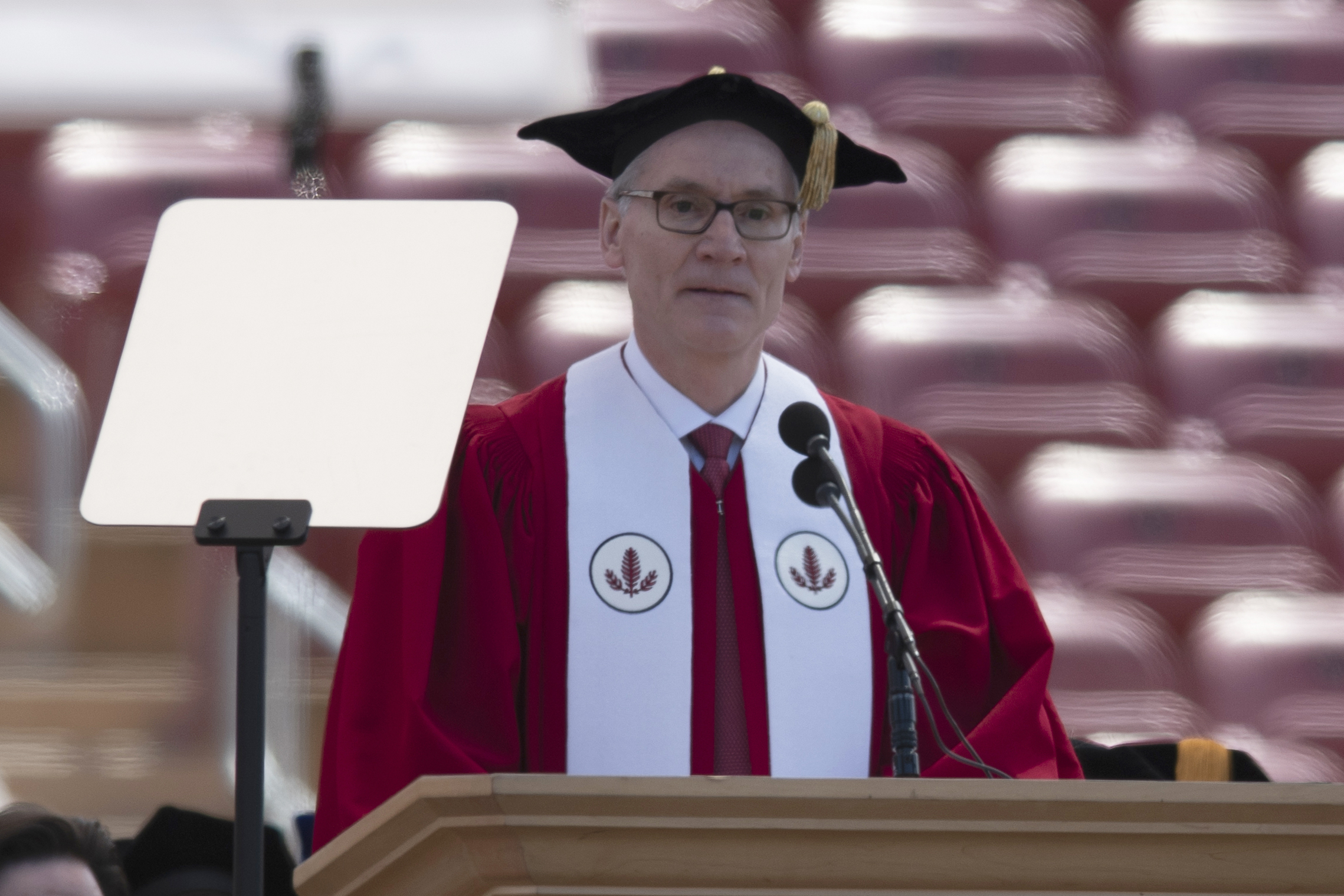 Stanford University President Marc Tessier-Lavigne speaks in 2019. He says he will resign at the end of August. (Yichuan Cao/Sipa USA/AP)