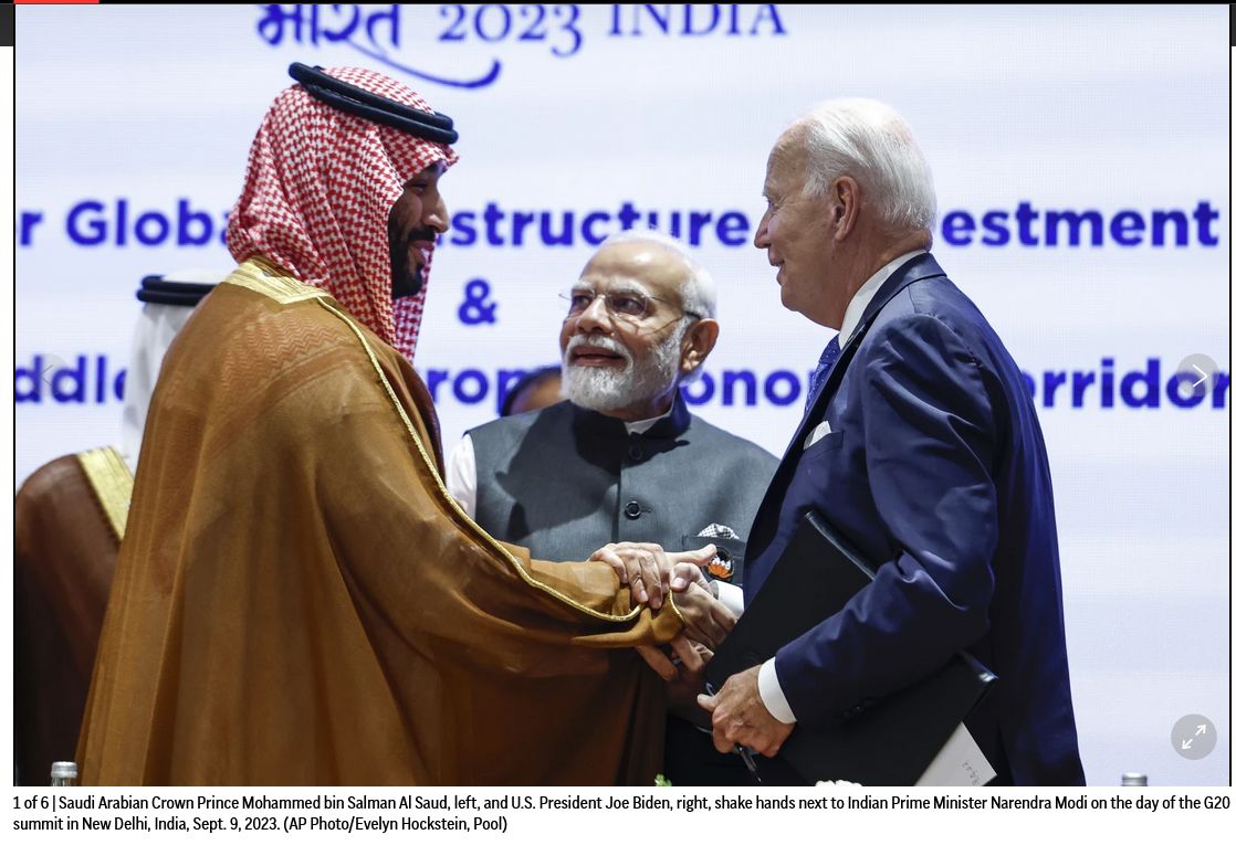 Biden warmly greeted Saudi Arabias de facto leader, Mohammed bin Salman, after they appeared together along with several other leaders at the Group of 20 summit Saturday in New Delhi. The leaders had gathered to announce an ambitious plan to build a rail and shipping corridor linking India with the Middle East and Europe.