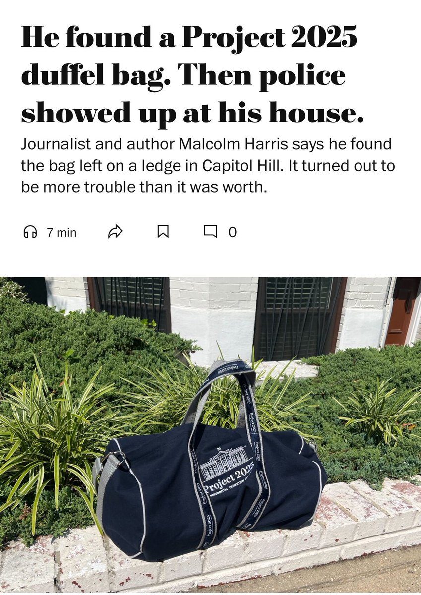 New: journalist Malcolm Harris found a Project 2025 duffel bag and Heritage Foundation documents on the street. Then a Project 2025 staffer called the police on him. 👇
