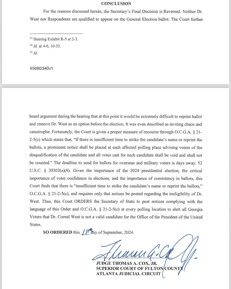 MAJOR BREAKING NEWS: A Fulton County judge disqualifies independent presidential candidate Cornel West from Georgias ballot, BUT his name will appear on the ballot and votes not counted. This Democrat-backed challenge reverses @GaSecofState Brad Raffenspergers decision. #gapol