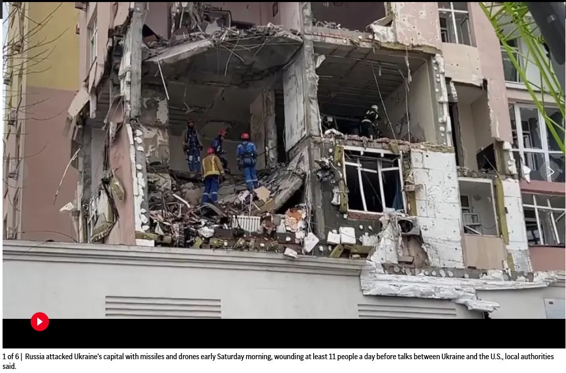 KYIV, Ukraine (AP) Russia attacked Ukraines capital with missiles and drones early Saturday morning, killing one person and wounding 27, a day before talks between Ukraine and the U.S., authorities said.