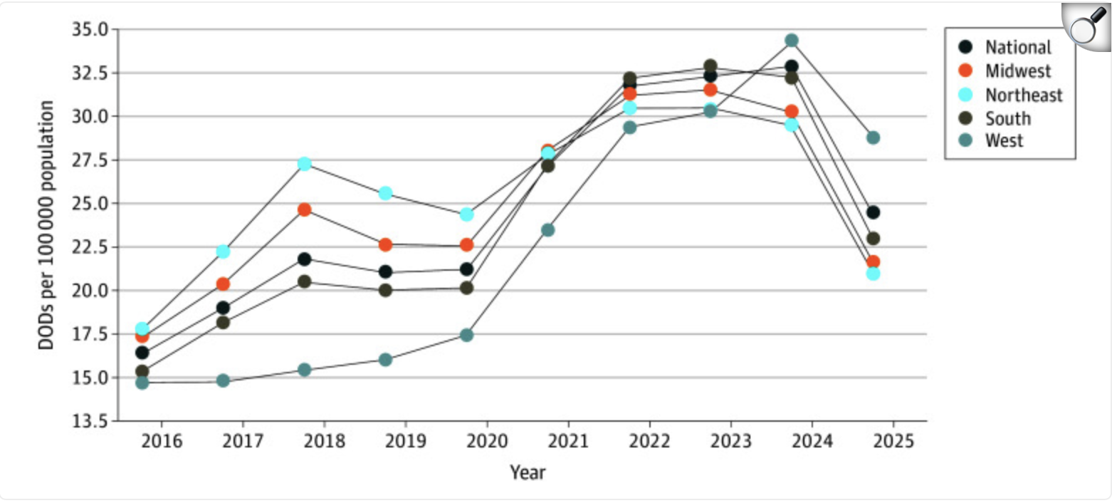 Annual Drug Overdose Death (DOD) Rates by US Census Region From October 2015 to October 2024. | NIH
