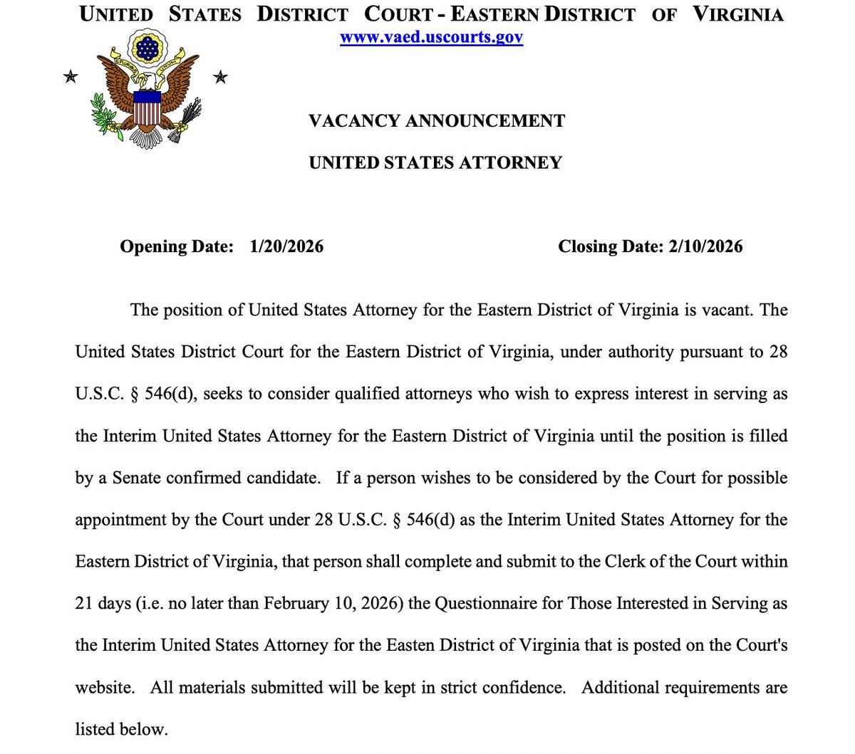 Chief Judge M. Hannah Lauck entered an order on Tuesday ordering the clerk of the court to post a vacancy announcement, soliciting applications from attorneys interested in filling the position of Interim U.S. Attorney for the Eastern District of Virginia.