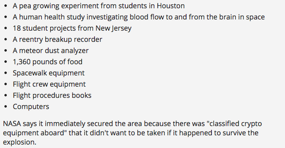 (449 posts)NASA (as in the public sector NASA) has had numerous failures of it's own, and has killed at least 17 astronauts that I can think off. (Apollo 1, Challenger, Columbia). Rocketry is extremely risky work, no matter who is doing it. Doesn't matter if we're talking about privatized companies, or the 100% state controlled Soviet Union (they were VERY good at exploding rockets).