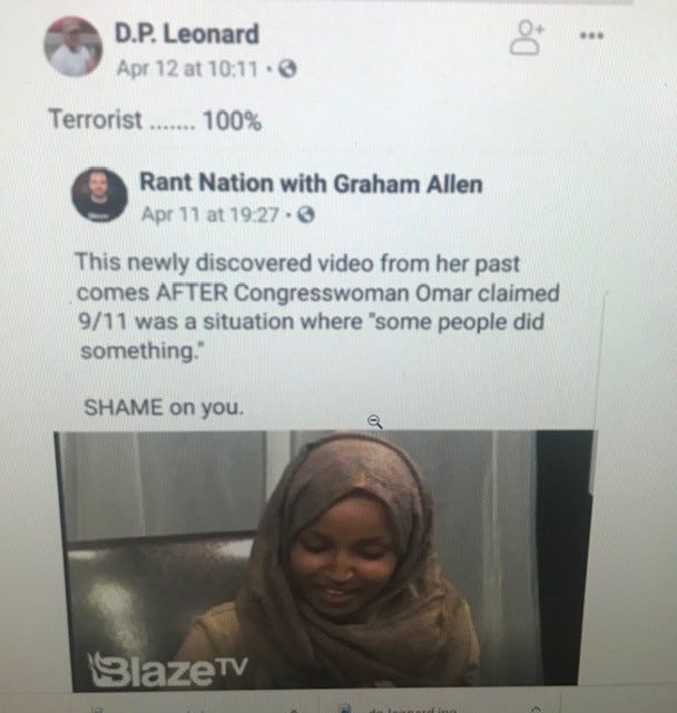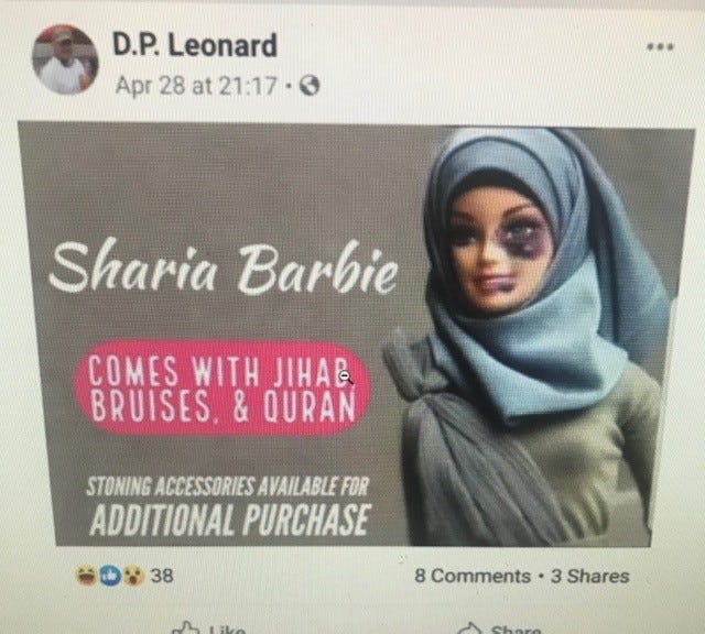 The post was not an isolated incident for the Army veteran and supporter of President Trump. Earlier that month, Leonard had posted a video of Rep. Ilhan Omar (D-Minn.), who joined Tlaib as the first Muslim women in Congress, with the caption, Terrorist . . . 100%. Later in April, he published a meme about Sharia Barbie, a brown-skinned doll in a hijab with a black eye and a purple bottom lip. Comes with jihab [sic], bruises, & Quran, the text read.
