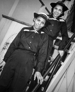 -- Olivia Hooker (front) with Aileen Anita Cooks (behind) are seen in March 1945 on the USS Commodore, during boot training at Manhattan Beach in Brooklyn, N.Y. (U.S. Coast Guard).