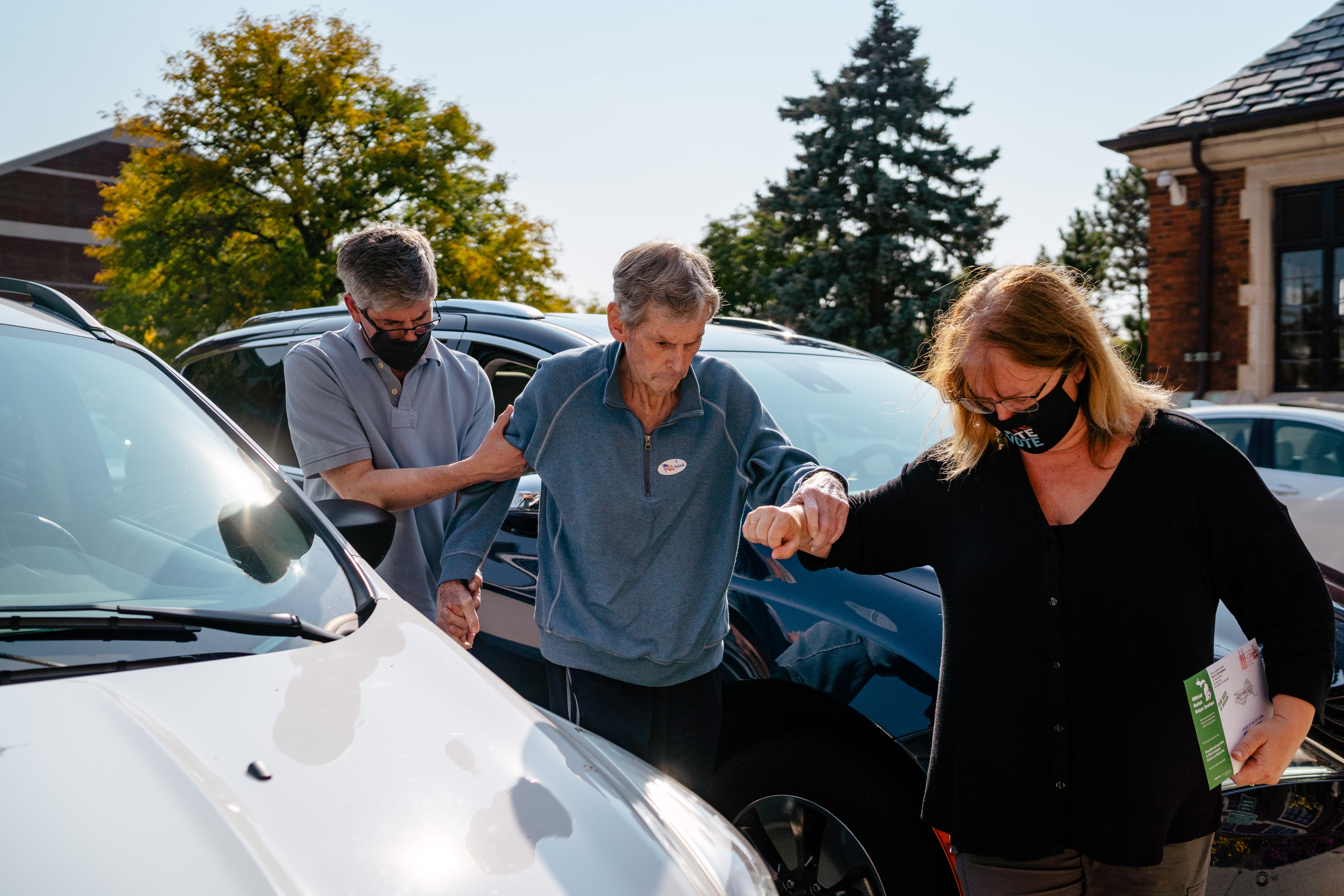 Jim Williams, 77, gets help from his son David Williams, 51, and his daughter in-law Debra Horner, 50, to drop his ballot off in the box outside of City Hall in Birmingham, Mich., on Sept. 24. (Nick Hagen for The Washington Post)