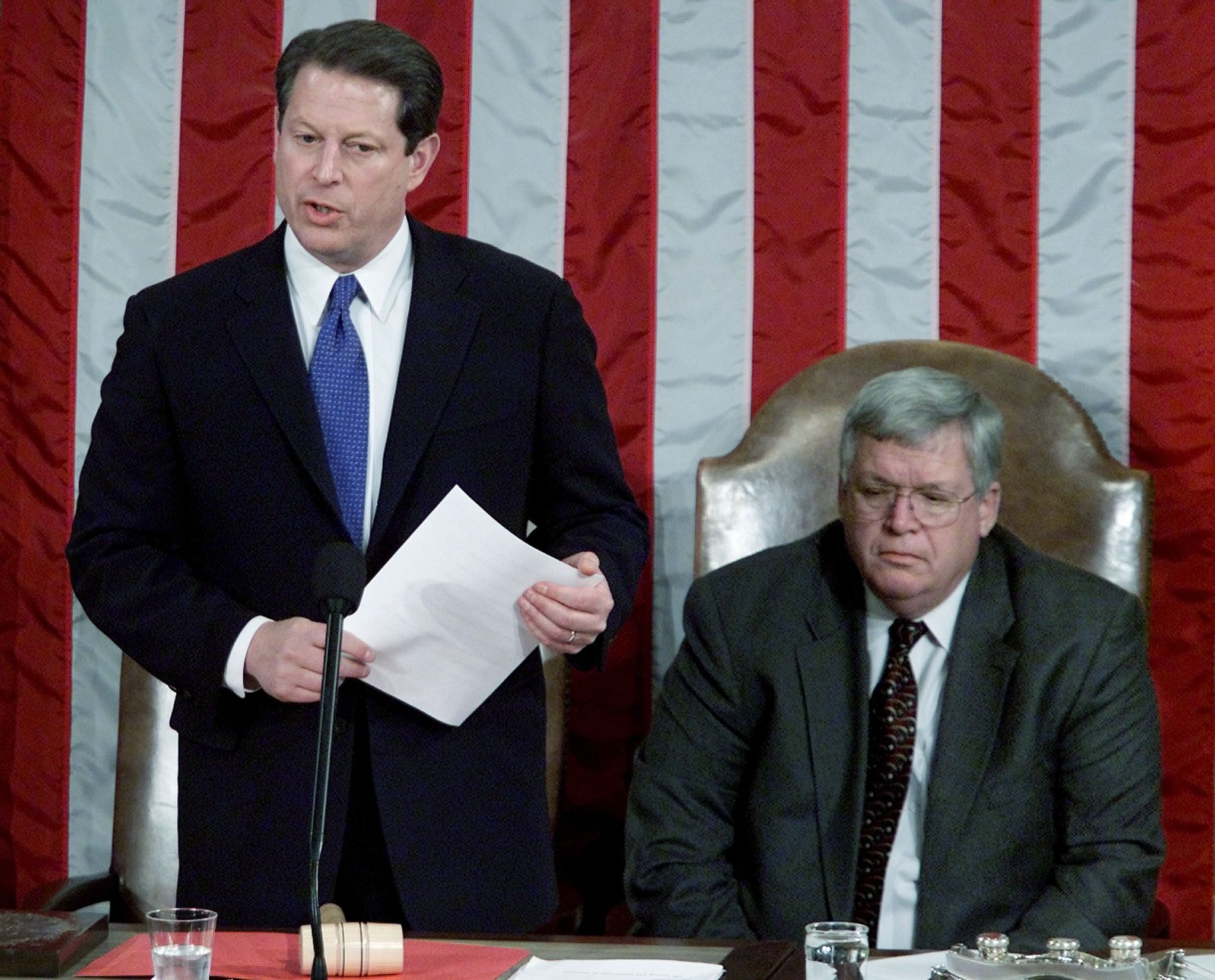 Vice President Al Gore, shown in the House chamber on Jan. 6, 2001, reads the results of the joint session in which Congress counted electoral votes from the November 2000 presidential election, declaring Texas Gov. George W. Bush the next U.S. president. (LARRY DOWNING/REUTERS)