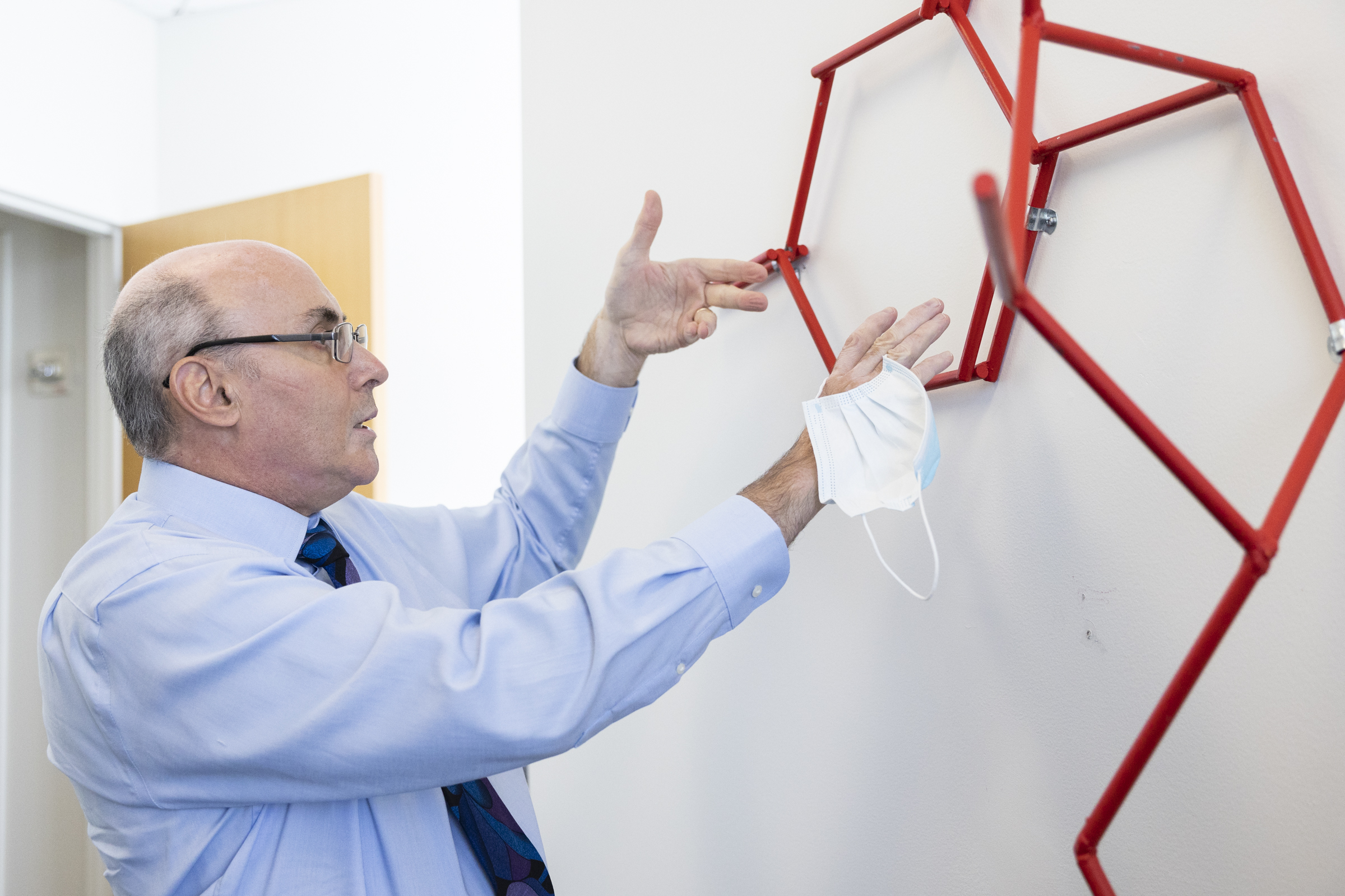 Drew Weissman describes the structure of pseudouridine, the molecule that made messenger RNA work, by pointing to a sculpture of the molecule welded by his daughter Rachel Weissman for his office at the University of Pennsylvania. (Rachel Wisniewski for The Washington Post)