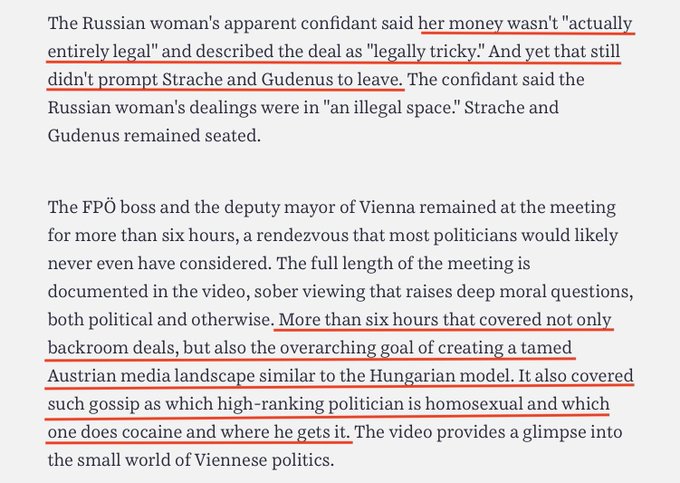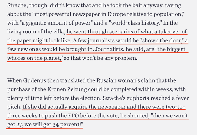 Must-read: it's about how Austria's corrupt right-wing government got caught conspiring with who they thought was a Russian oligarch's niece to let Russia change the election outcome by *owning the media.*