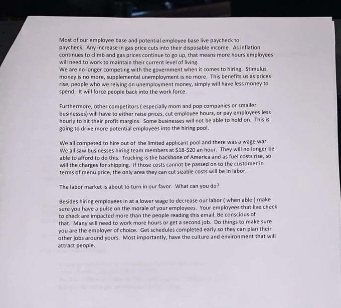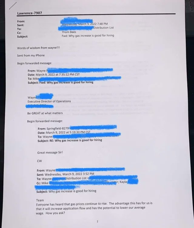 Applebee's manager email touting gas prices + poorer employees equals lower wages to hire.