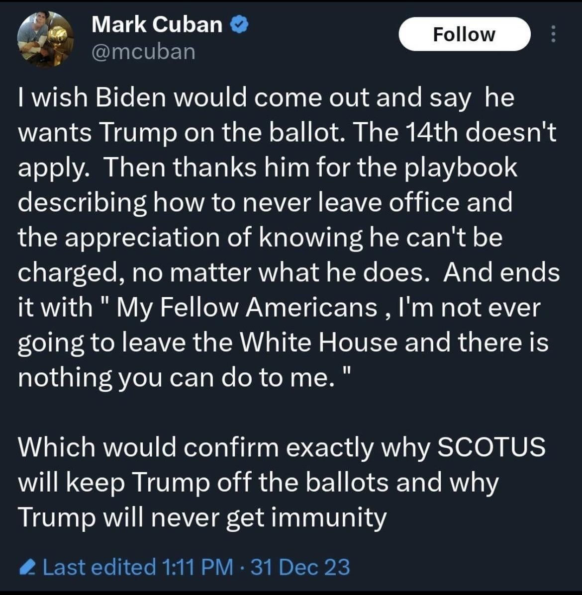 (26,145 posts)thus he doesn't have any immunity at all, doesn't have any presidential powers at all.