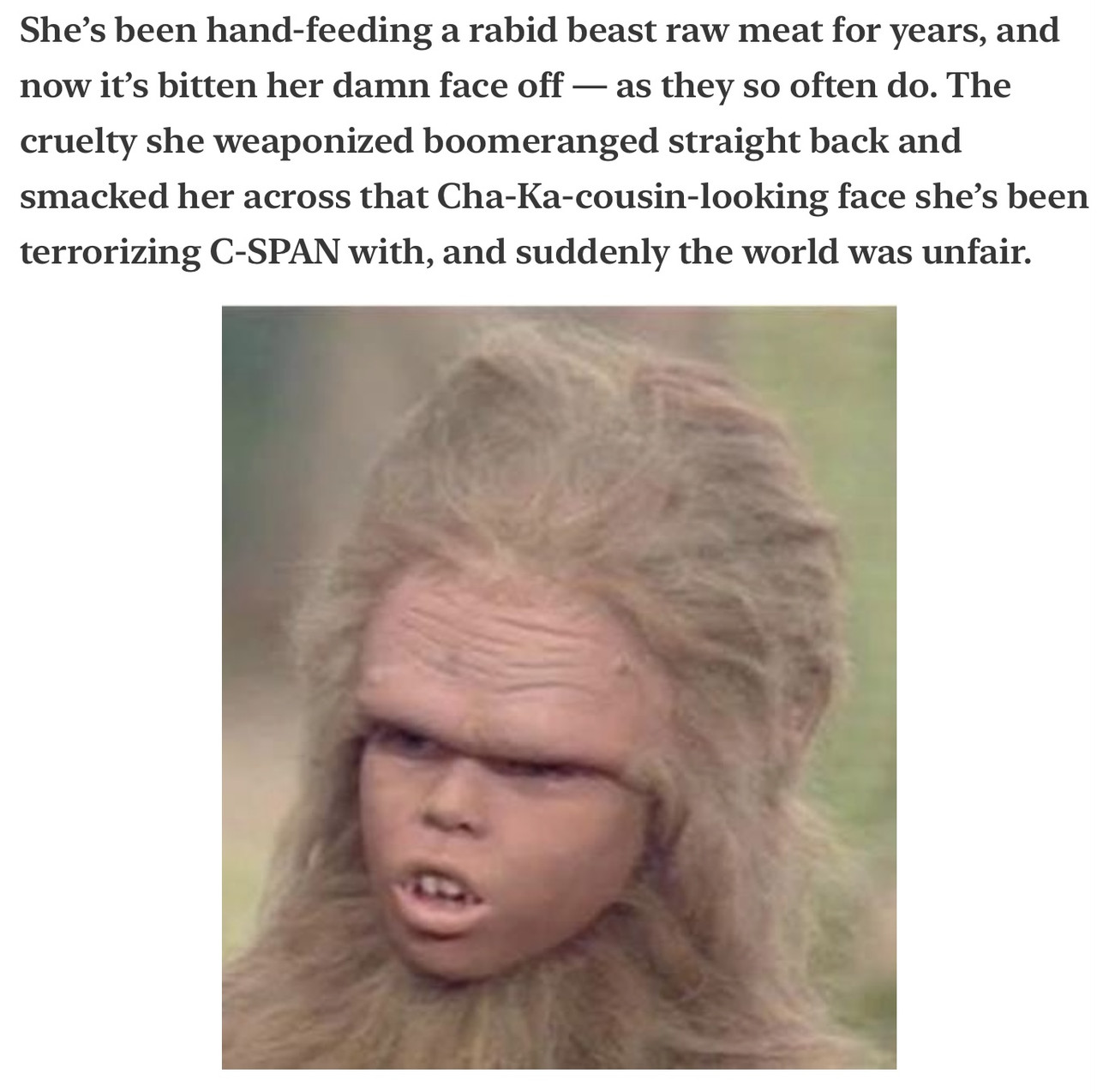 How dare you demean Cha-Ka by comparing him to this vicious she man. She deserves anything she gets. After years of having her head up Drumphs ass where she didn't know if if was night or the inside of his colon she now has seen the light. Waaaaah, Waaaaah I am a good person now and more people hate me than before I was a heartless witch.