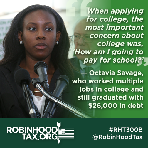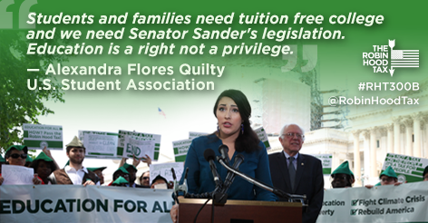 The College for All Act and the Robin Hood Tax would set a 0.5 percent tax on most stock transactions, and a lesser tax on bond and derivative trades. Such a tax has been championed for years by NNU, the countrys largest organization of registered nurses, and other healthcare and climate change groups and is already in effect in more than 40 countries around the world, including Britain, Germany, Switzerland, and China. A similar Robin Hood Tax bill, H.R. 1464, introduced by Rep. Keith Ellison, is pending in the House of Representatives. The tax is estimated to raise about $300 billion per year to fund programs such as free higher education, healthcare for all, and a reversal of climate change.