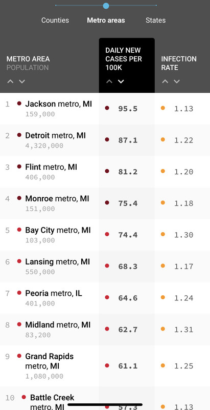 Michigan is crazy in comparison, having 9 of the top 10 worst metro areas for new cases per population, among the entire country. And 12 of the worst 15, per CovidActNow.