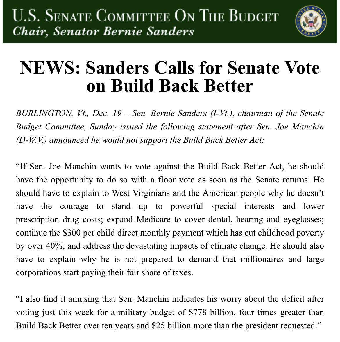 Sign Bernie's petition if you agree the United States Senate must vote on the Build Back Better Act as soon as they return from recess. If Joe Manchin wants to vote NO, then let him explain to the working families of West Virginia and America why.