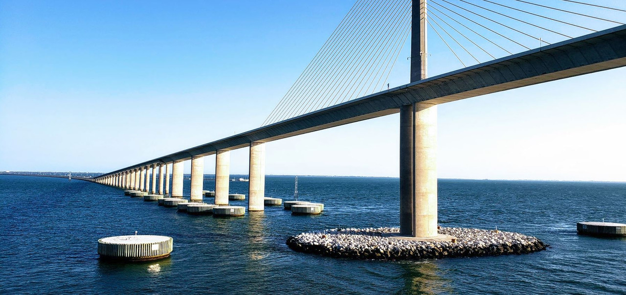 (11,669 posts)Passed under this magnificent structure at sunrise while on a Baltic cruise. Originating as a bridge and ending as an underwater tunnel, the high bridge part of the Øresund Bridge has the longest cable-stayed main span of all bridges in the world. That goes for both road and rail traffic. And the tunnel part of Øresundsbron is the world's longest underwater tube tunnel, also for both road and rail traffic.