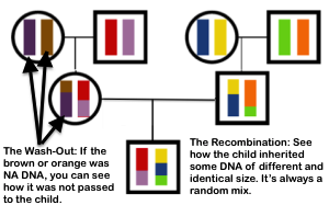 NOW HERE'S THE TRICKY PART! You don't inherit your reshuffled DNA in fixed percentages as the chart above suggests. Rather you inherit your DNA sequences in chunks or segments of varying "lengths" (aka CentiMorgans) as shown in this illustration:
